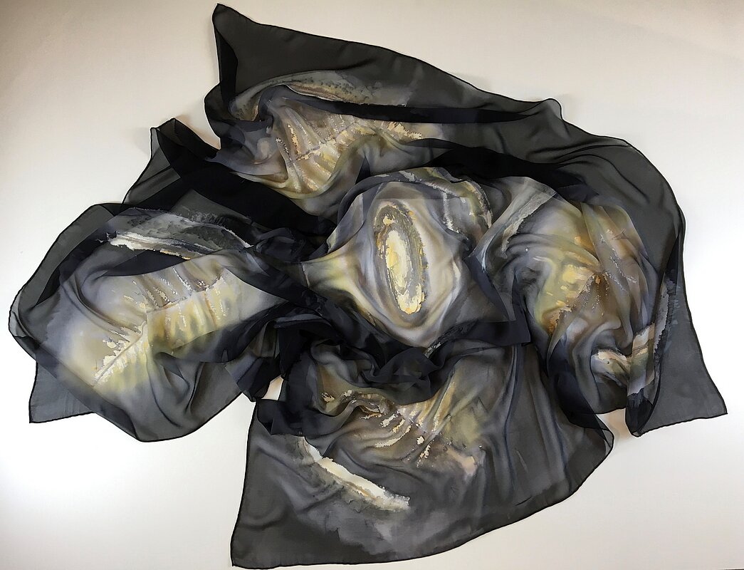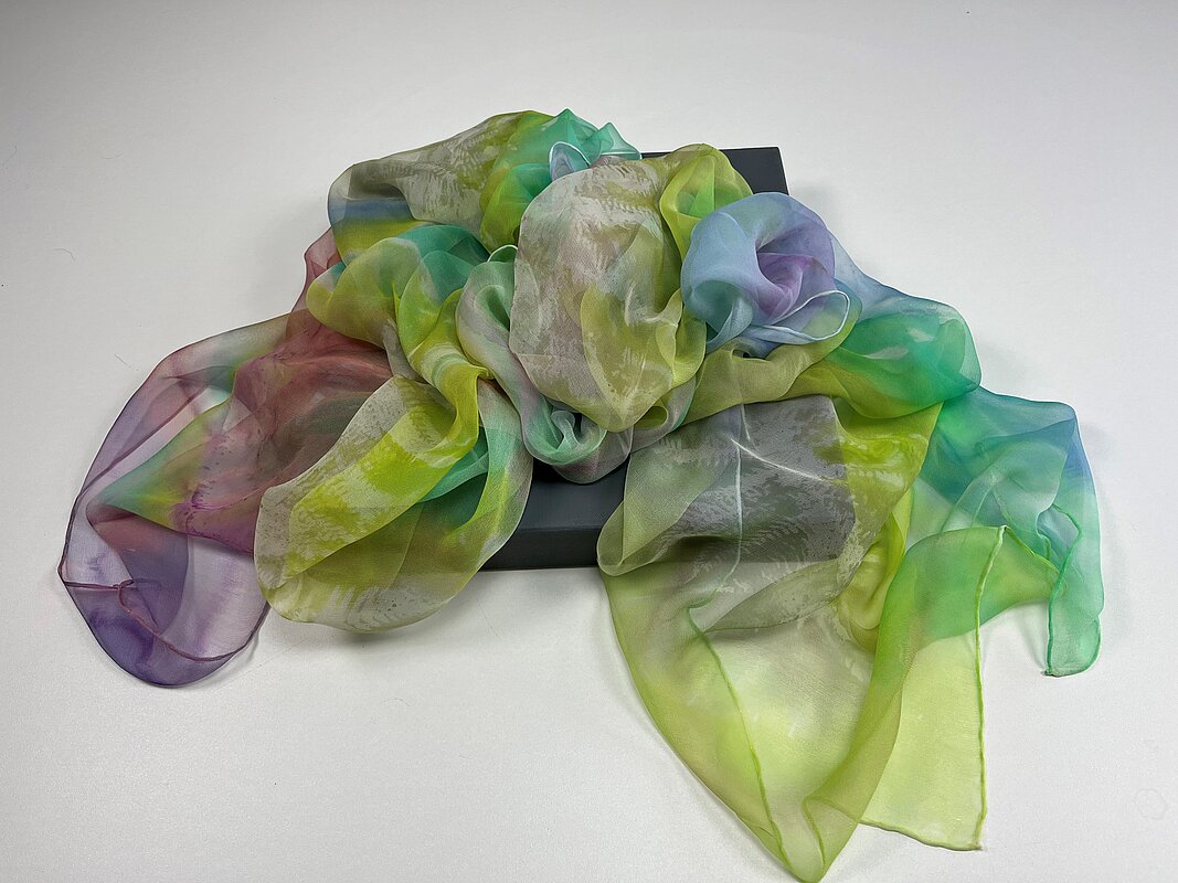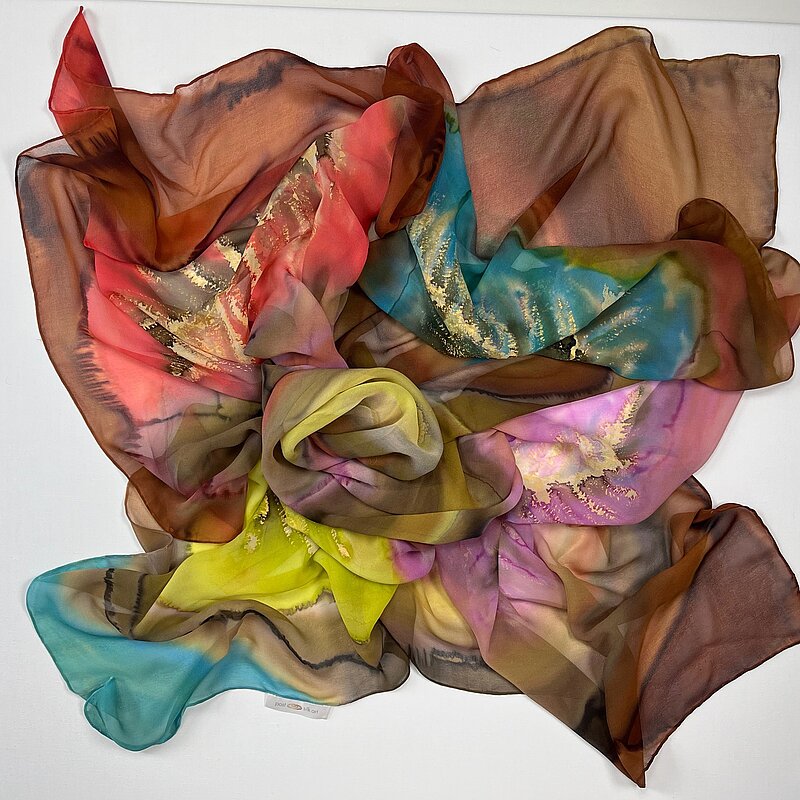 Ich kreiere und male in meinem Atelier in Brugg/AG exklusive Seidenfoulards. Es sind Unikate, die sich weit weg von der üblichen und bekannten "Seidenmalerei" bewegen. Die Farbverläufe beinhalten das ganze Farbspektrum und die anschmiegsamen, temperaturausgleichenden Seidenschals passen deshalb perfekt zu allen unifarbenem Lieblingsteilen. Die grosse Brillanz der Farben ist unvergleichlich und durch das aufwendige Dampf-Fixierverfahren werden sie lichtecht und sogar waschbar gemacht. Die Preise bewegen sich zwischen CHF 150 und 490 je nach Grösse und Material.